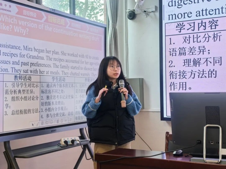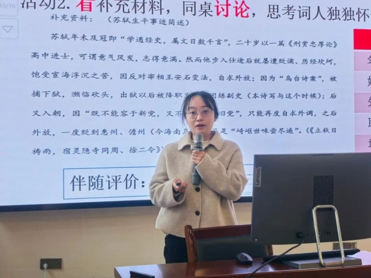 会议首先进行了两场精彩的说课展示。英语科组陈琳老师以“如何写出连贯的文章”为主题,围绕“基于目标达成的教学评一体化设计”展开说课,英语科组杨宁老师作点评。语文科组李惠湘老师则从“生命中的‘放逐’与‘坚守’”角度,深入解读《念奴娇·赤壁怀古》,语文科组凌莉老师参与评课。两场展示充分体现了我校区教师对“教学评一体化”理念的深入理解和扎实实践。