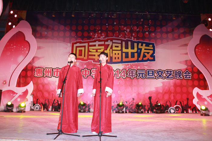 晚会在歌舞《中国喜》中拉开帷幕。演唱嘉宾、中央电视台《非常6+1》栏目冠军、歌星罗天送演唱的歌曲《蓦然回首》博得了在场的一片喝彩。节目演出中,无论是钢琴演奏《不能说的密》、歌曲演唱《亲吻祖国》、歌剧表演《你发火就爱生气》、舞蹈《年年有余》、小提琴独奏《西班牙交响曲第一乐章》、古筝三重奏《汉江韵》,还是话剧《黄帝的新衣》、配乐诗朗诵《祖国,我亲爱的祖国》、相声《我要穿越》、街舞《I like to move it》、武术《武功乾坤》、管弦乐《超级玛丽》等,都充分展示了学校在校园文化建设和音乐特长教育方面的成果。晚会在学校合唱团的一曲获奖作品《铃儿响叮当的变迁》中落下帷幕。