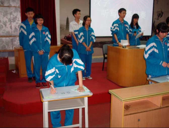 本次大赛学生表现非常踊跃,有近50个队参加比赛。比赛分初赛、决赛两个阶段,并设有团体赛和个人赛两种形式。比赛时,台上选手眉目紧锁,台下同学摩拳擦掌。现场观众时而为选手写出一个个难字而振奋,时而为选手一点小小的失误而惋惜。最后高一13班、19班率先闯进团体决赛。