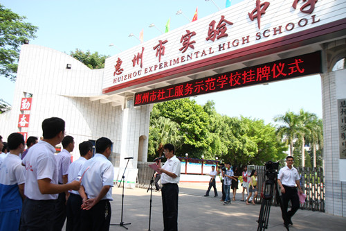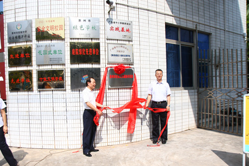 仪式上,郑汉强副书记、戴立波副局长分别作了讲话并为惠州市社会服务工作示范学校揭牌。
