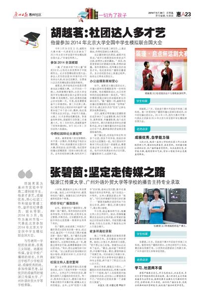 今年3月26日至31日,越茗作为惠州唯一代表前往北京参加了2014年北京大学全国中学生模拟联合国大会,广东省仅有两人。一篇《“武装冲突下的儿童”探究》论文,让他在众多优秀学子中脱颖而出。此次全国模拟联合国大会,参会人员包括全国89所高中的470名学生代表,80余位观察员、志愿者以及近百名模拟联合国指导教师。