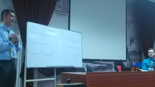 3月27日下午,我校中美教育交流活动在学校多功能室举行。来自美国俄亥俄州吉尔莫学校的Tyler Foote和来自加利福尼亚赛维特男校的Thai分别为我校高一、高二年级部分学生模拟了美国高中课堂,让学生了解美国课堂模式,讲解美国中学学生如何学习及生活。