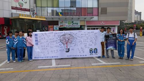 为进一步加强我校师生环保意识,自觉践行低碳生活方式,共同推进节能减排,建设资源节约型和环境和谐型校园,我校青年志愿者协会在校内外举行了“地球熄灯一小时”环保宣传活动。