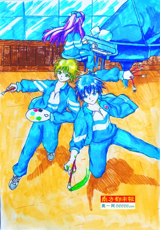 他的同班同学肖遥、黎钊辰、杨铭卉也有同感。这三名女生为了画《漫画实中》,有时甚至奋战到凌晨一点多。“我们是用电脑软件画的,三个人中只有黎钊辰比较熟悉,我们就组了一个Q Q群交流想法。有时画好一个分镜头,就用手机拍下来传到Q Q群里讨论。疯狂的时候,边讨论边画画一直到了凌晨一点多。”