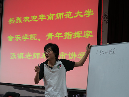 17日晚张老师对我校管弦乐团进行了辅导,18日下午在我校多功能厅,张老师面向全市中小学教师代表举行了 “指挥常用技法”等的讲座。市教育局体艺卫科副科长刘苗、市音乐家协会主席王少辉等参加了讲座。