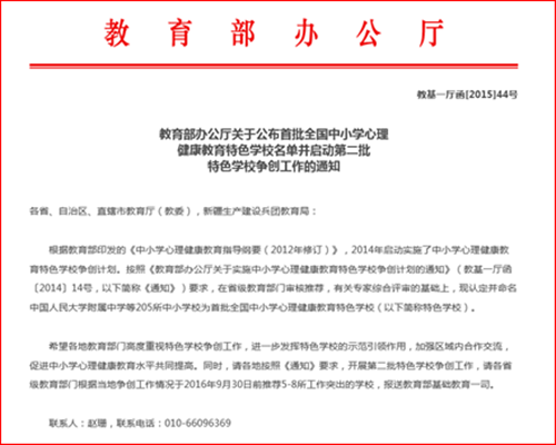 据教育部办公厅日前公布的首批全国中小学心理健康教育特色学校名单,我校在教育部开展的全国中小学心理健康教育特色学校争创活动中,经审核推荐及全国专家综合评审,最终被教育部认定为首批“全国中小学心理健康教育特色学校”。