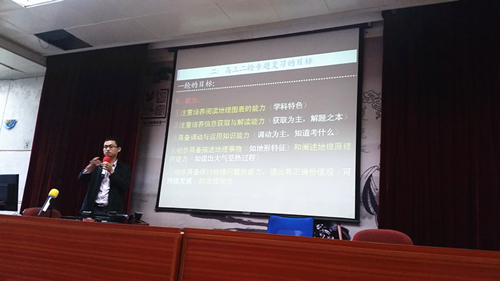 随后,曾玮教授做了《关于地理高考》的专题讲座,曾教授从五个方面对老师们展开了培训:一是如何理解全国卷普通高考的考试性质与改革方向,高考作为选拔性考试,必须具有一定区分度和难度,但系数保持稳定,改革方向将重点考察创新能力方面的内容;二是如何解读地理高考考核目标内容,必须结合背景材料、试题设问、试题分值等方面进行;三是如何分析全国卷地理高考高频考点,主要还是以主干知识为主,不回避热点和重叠考同一区域;四是二轮以后地理高考复习如何备考,认为一轮复习应注重面,打好基础关,二轮复习应建立知识联系,完善能力结构;五是如何训练地理高考答题技巧,应通过专题训练增强学生能力,不断总结方法,反思失误点,修正思维,提高得分能力。