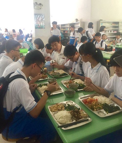 放学后,校长黄津海及部分中层干部来到饭堂,检查了饭堂安全及卫生工作,与同学们共进午餐,愉快交谈。从中了解同学们对饭堂的需求,对学校的建议,其乐融融。