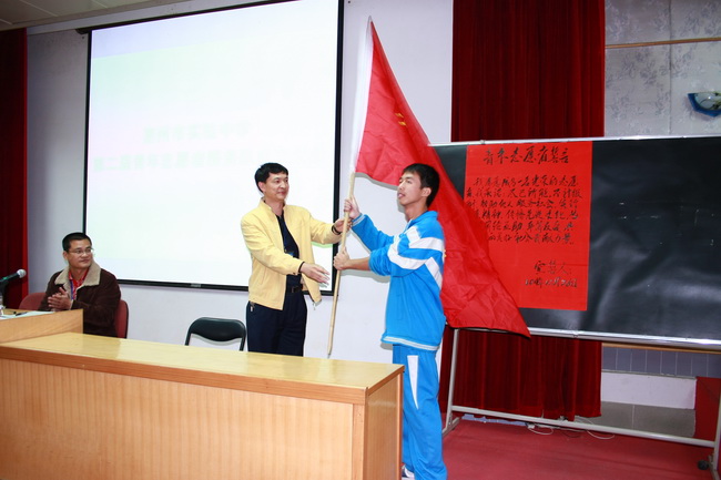 受校长邓凡用委托,校党总支温和副书记为青年志愿者服务队授旗,并作了重要讲话,他简要回顾了世界各国开展青年志愿服务情况,总结了我校青年志愿服务工作,提出了本届服务队的工作目标。