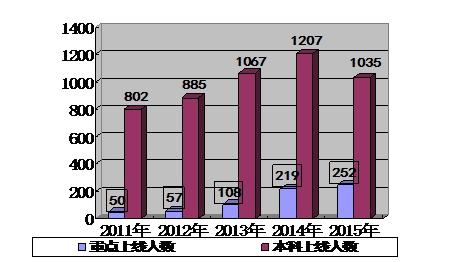 2013年本科上线人数突破千人大关后,2014年高考再创辉煌,重点本科上线人数两年翻两番。2015年高考重本上线252人,上线率15.94%,较我校2014年增长7%,超出惠州市重本率7%;本A上线735人,上线率46.49%,较我校2014年增长12%,超出惠州市本A率20%;本科上线1035人,上线率65.46%,较我校2014年增长13%,超出惠州市本科率22%。重本上线率增长、本A上线率增长、本科上线率增长,“三率”增长位列全市前茅。这充分彰显了学校“低进高出,高进优出”的人才培养能力与卓越的办学实力。